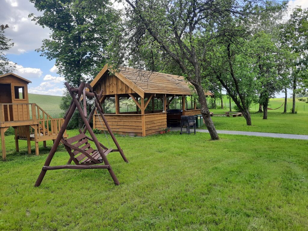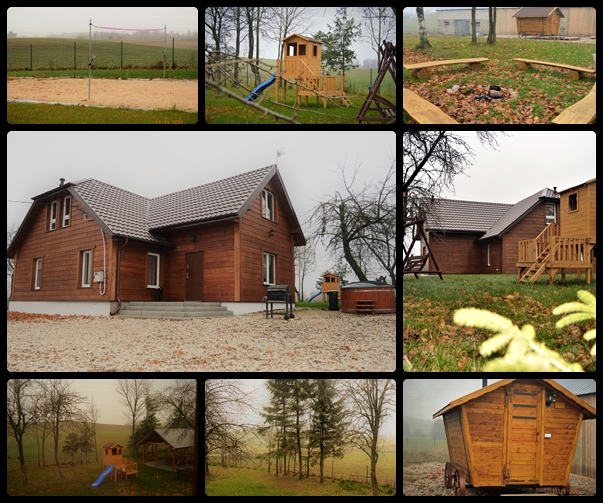 Dużą altanę, plac zabaw dla dzieci, saunę , balię, boisko do siatkówki, miejsce na ognisko oraz grilla